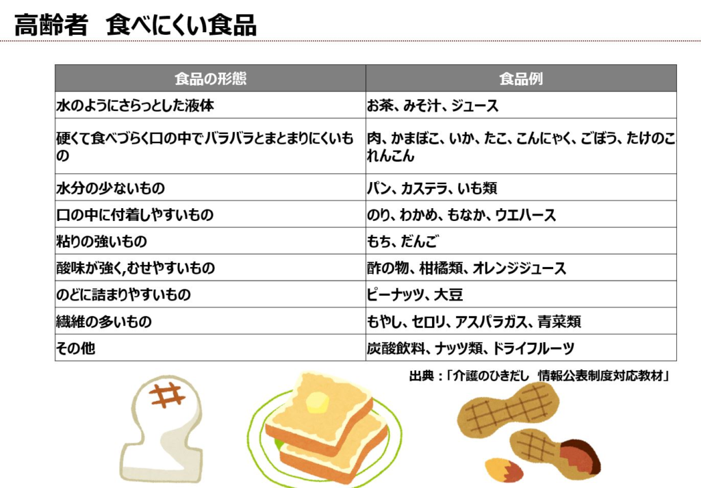 高齢になると飲み込みづらい、食べづらいといった食べ物があり、誤嚥や誤飲に気をつけなければなりません。