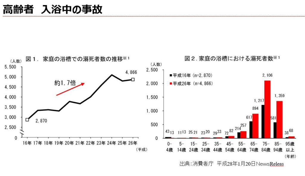 厚生労働省の調査によると家庭の浴槽での溺死者数は、平成 26 年に 4,866 人で平成 16 年と比較すると10 年間で約 1.7 倍に増加したという。このうち約9割が65歳以上の高齢者で特に75 歳以上の年齢層で増加している。