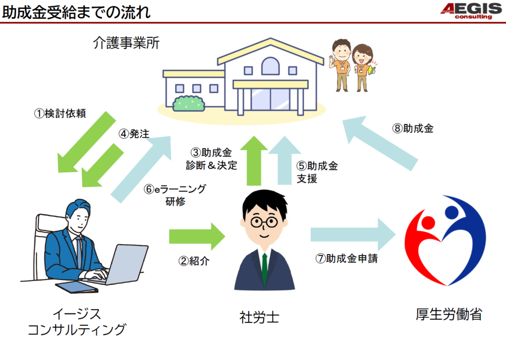 導入から助成金受給までの全体像を、介護事業所・イージスコンサルティング・社労士・厚生労働省の役割分担に沿ってご案内しています。検討依頼、助成金診断、発注、eラーニング研修、助成金申請、受給までの流れを把握しやすい構成です。