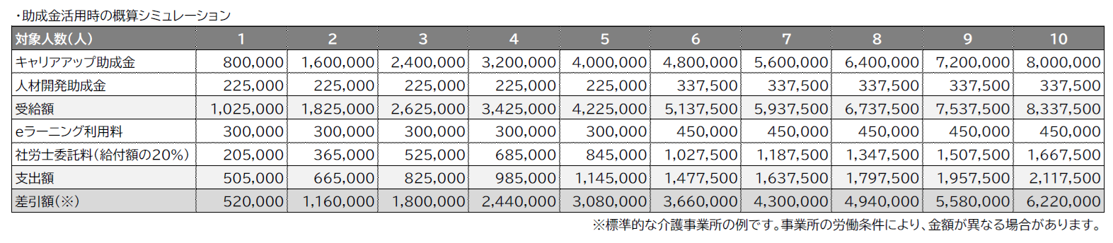 対象人数1~10人の助成金活用時の概算シミュレーションをご案内しています。キャリアアップ助成金、人材開発助成金、受給額、eラーニング利用料、社労士委託料(給付額の20%想定)、支出額、差引額を一覧で確認できるため、導入判断の参考にしていただけます。